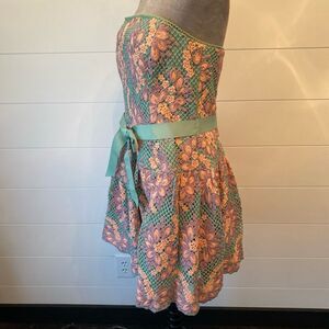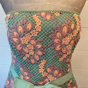 MIDNIGHT ESTER DRESS $570.00 Lovely mini cocktail dress in a beautiful floral lace. Style features a strapless neckline and fitted bodice with a grosgrain bow at the waist. Full volume skirt with scallop edge hem. Full bustier construction inside. Fully lined. Hidden back zipper. 100% Polyester. Dry clean only. Pit to pit 18” Waist 17” Length 30”