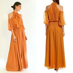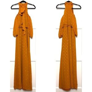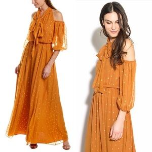 Distinctive feminine design in a bold turmeric color flecked with gold and exceptional details make this maxi dress by Shoshanna Midnight a standout.