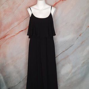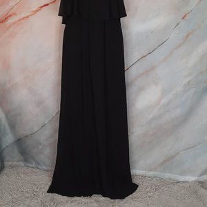 Caitlin ruffle maxi dress in Black chiffon color. Full length lining. 2 ways to wear, off shoulder look or just with straps. 100% Polyester. Adjustable straps. Elasticized waist. Has tie/sash at waist. New without tags. Model photos from website differ from actual color.