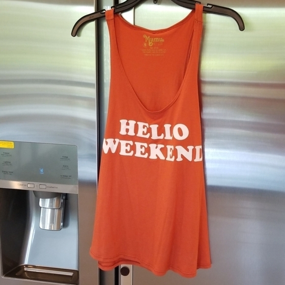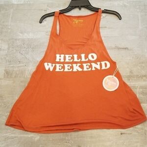 Tank top with "Hello Weekend" graphic