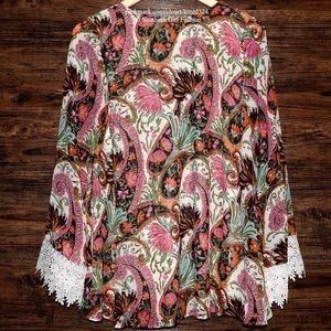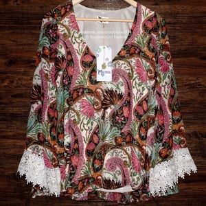 Printed blouse featuring sheer long sleeves with lace trimming and v-neckline.
