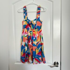 Not just a fling, but a long term love in this Rainbow Pop print mini dress! Lightweight with thick, smocked straps and a timeless empire waist make this an easy throw and go look to bring you through all the warm weather moments this season.
