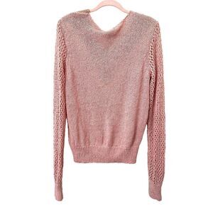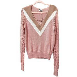 Light pink, white and tan patterned slouchy sweater. Scoop neck. Semi sheer open knit sleeves. Acrylic, nylon blend. New with tags! Size medium