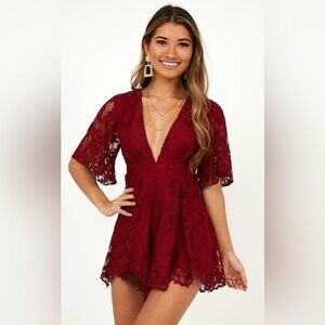 SHOWPO | BREAK THE BAR PLAYSUIT ROMPER IN WINE LACE | Red | Size 6 Medium