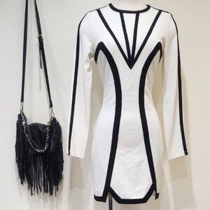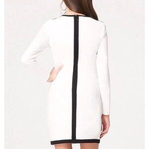 MUST-HAVE! An absolutely stunning, timelessly hot statement dress that creates instant drama! In my opinion, it's one of the best dresses made by Bebe ever! It was rocked by many celebrities including singer Mya and Vanderpump Rules’ star Ariana Madix. Comes in gorgeous Ivory with striking geometric colorblock trim in contrasting Black. Designed with a flattering bodycon silhouette, black trim that insinuates waist and shapes body into hourglass shape, crew neckline, long sleeve, unique cut-out hem, soft stretchy lining, and concealed zipper closure on the back. Made from high-quality material with some stretch (50% Rayon, 5% Spandex, 45% Polyester). It's a very comfy and versatile piece! It will look equally amazing with your fav moto boots for edgy chic, as it is with killer heels and clutch for evening outfit. Size XS. Approx measurements flat: Pit to pit 16", Waist 13.", Sleeve 23.5", Length 32.5". NWOT from a clean smoke-free home.