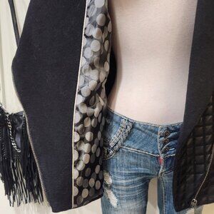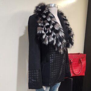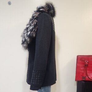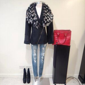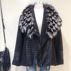 A VERY RARE FIND! This VTG stunning statement piece is from Dino Gaspari, a Montreal design label known for high-end polished outerwear. This coat is EVERYTHING, a real investment that will last a lifetime. It is a perfect blend of glamorous Old Hollywood and edgy-chic moto grit. Handcrafted from outstanding quality velvety soft and warm 100% cashmere. Fuchering fitted silhoette, front asymmetrical YKK zipper closure, mosaic genuine leather inserts on the front, back and sleeves, long sleeves with lightly padded shoulders, panelled construction, side pockets, GORGEOUS oversized collar made from genuine tipped fox fur in Black, Crystal, smooth satin lining in polka-dot print. An exceptional quality piece, very well made and tailored. Very comfy, lightweight, yet warm. It is also super versatile and will look equally fabulous with your favorite leather pants/ distressed denim skinnies for edgy chic, as it is with dressy outfits, open or closed. Size 6. Approx. measurements flat: Armpit to armpit 20", Waist 18.25", Sleeve 24", Length 26". Excellent vintage condition! Comes from a clean, smoke-free home.💖Please, no low-ball offers for this stunner!💖