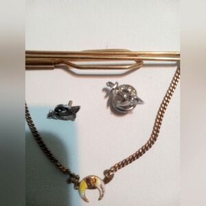 In addition to this tie clip you will receive 2 Masonic/Shriners cap/hat pins. These are sterling with rhinestones. Both pins are missing a couple of rhinestones and one is missing the screw back. One has clear/white rhinestones and the other has the clear/white and blue rhinestones. These rhinestones can be replaced by the buyer at a reasonable price if so desired.