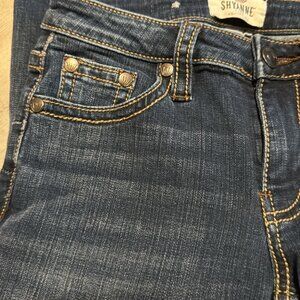 Like new, but used condition Stylish boot cut jeans by SHYANNE. Indigo color with classic stitching. Ideal for casual wear. Size 26 short. Waistband measurement lying flat is 13.25 inches, rise is 8 inches, inseam is 32 inches.