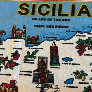 New without tags. Tea towel with Sicily depicted with all the tourist spots pictured. Approximately 22” x 29”.