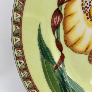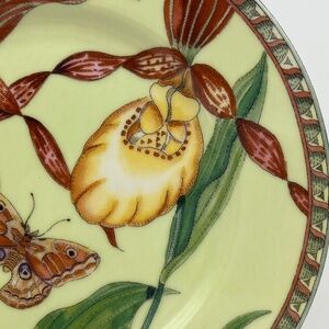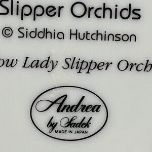 Beautiful , Yellow Lady Slipper Orchids with butterflies on a decorative plate with trim. Titled “ Slipper Orchids” by Siddhia Hutchinson. (Andrea By Sadek). Flowers, leaves, and a butterfly, on a yellow/green background. The trim is decorative, triangle design that compliments the flowers. The backstamp is large, and easy to read. SZ: 8” round.