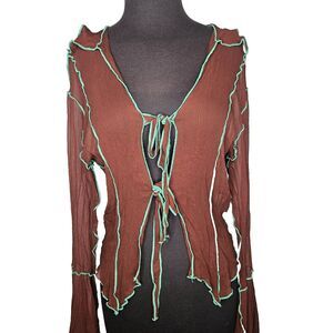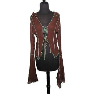 SIEDRES Zee Fluted Sleeve Tie Front Shirt 38 Medium Brown Green Sheer Fairy $350