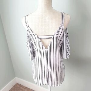 Sienna Sky women's striped top. Size Small. Cold shoulder. V neck and back. 100% polyester. Like new. No tears or stains.
