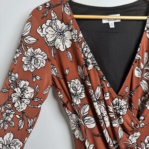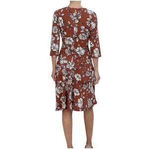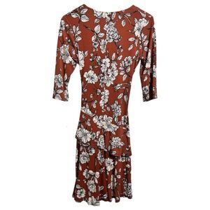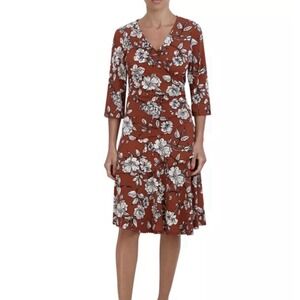 New with tags. Signature by Robbie Bee. Rust colored a-line dress with white floral design. Vneck. 3/4 sleeves. Knee length. MSRP - $94.00