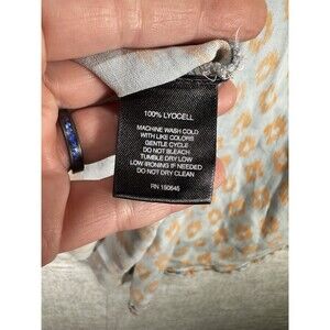 This Signature Studio women's button-up shirt features a vibrant multicolor pattern with hues of blue and orange. The shirt is made of Lyocell material and is machine washable for easy care. It has a classic fit, long sleeves, and a collared neckline with a button closure. This shirt is perfect for any casual or formal occasion and will be a great addition to any wardrobe.