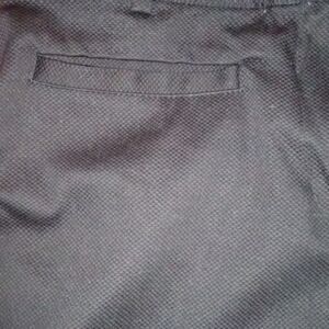 Two front pockets, one back pocket, side slits in bottom, zipper front with hook closure, five belt loops, good stretch, 98% cotton, 2% spandex.