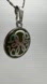 • Pendant: A striking circular disc, approximately 3/4 inch in diameter (as shown next to a U.S. penny for scale), features a lush green enamel background with an elegant mirrored silver Celtic knot motif at its center.