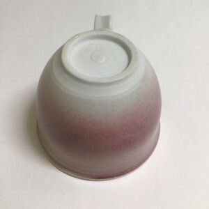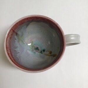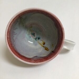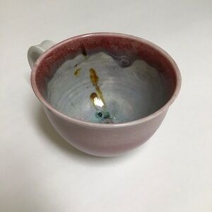 This is a beautiful, studio-crafted handled coffee cup in shades of pink, blue and lavender. The outside has a matte finish, and the interior has a glossy drip glaze. Appears new?
