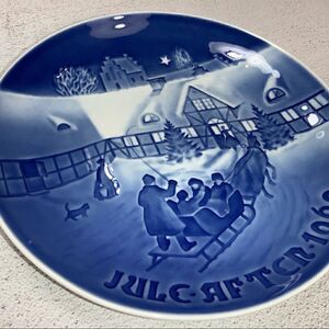 The 75th plate in the Christmas Series by Bing & Grondahl ( B & G ), this is a collector plate commemorating Christmas 1969. B & G started making porcelain Christmas plates in 1895 and has made one each year since. This plate is approximately 7" in diameter and depicts the hostess of a country home as she comes forward to meet her guests who have come by horse-drawn sleigh to share the Christmas festivities. The wintery scene was created by Henry Thelander and the plate was made in Denmark. Two holes at plate back for wall hanging with appropriate gauge wire or other flexible cordage. It is in excellent condition with no flaws.