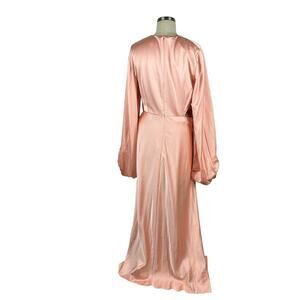 Features long bell sleeves, round neck, long length with slit, back zip closure, side cut out details. Blush pink color.