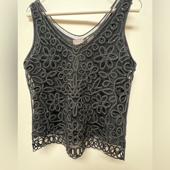 Chic black lace tank with floral design beaded Sleeveless and stylish. Perfect for layering or standalone wear.