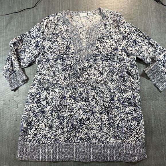SIGRID OLSEN Blue & White 100% Linen Floral Paisley Boho Tunic Top SIZE L