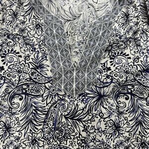 The product is a stylish and comfortable Sigrid Olsen blue and white floral paisley boho tunic top in size L. Made from 100% linen, this pullover blouse features a V-neckline and is machine washable for easy care. Perfect for women who appreciate colorful and trendy clothing, this tunic top from Sigrid Olsen is a unique and fashionable addition to any wardrobe.