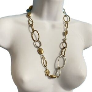 SIGRID OLSEN Gold Siver Textured Links & Beads Toggle Clasp Necklace. Measures 26" and has toggle clasp. Very good condition with slight scratches to a couple of beads. Very nice necklace.