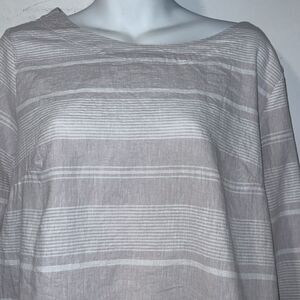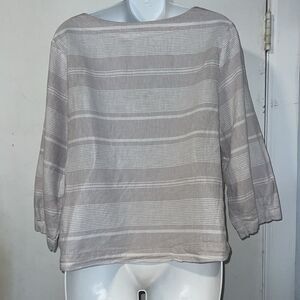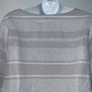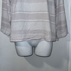 Taupe and white striped pattern, side slits,long sleeve, balloon sleeve, round neck, linen cotton blend. Excellent condition. Size large, measures 21” from armpit to armpit and 21” from top of shoulder to bottom hem.