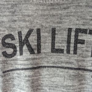Cozy gray sweater. Features 'SKI LIFT' text in black. Perfect for casual wear. Adorable sweater for those skiers or snowboarders out there!
