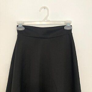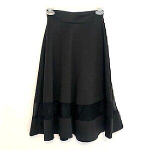 Solid black a-line skirt. Semi sheer mesh stripe trim. Pull on. Elastic waist. Midi length. Business casual work office church party neutral spring summer fall autumn
