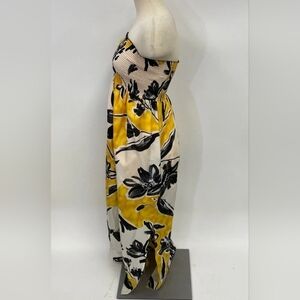 Elegant strapless maxi dress with bold floral patterns. Features vibrant yellow and black colors. slimming waist. A silky smooth 100% silk dress. slit in front side. beautiful for vacation vibes or cruise or everyday lunch outting.