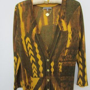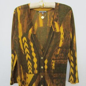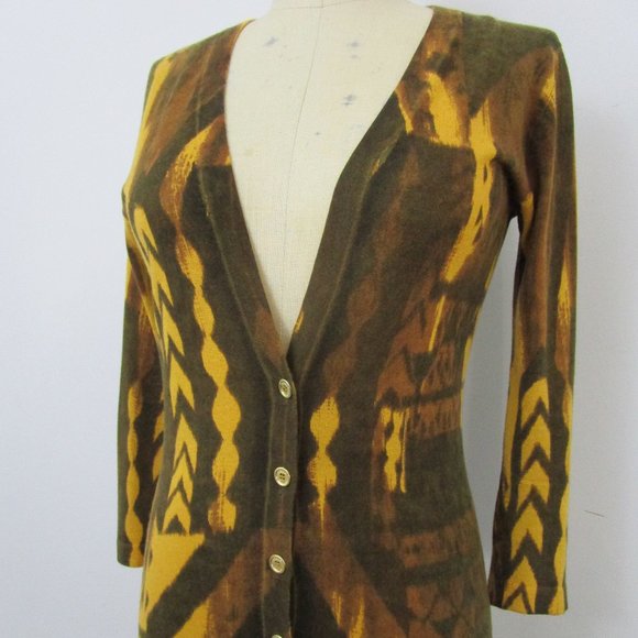 SILK CASHMERE Cardigan Sweater Knit Abstract Brown Gold Logo Button