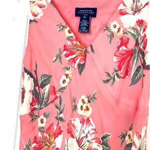 100% Silk Body with Polyester Lining. Pull on, fitted through the bust with definition in the waist and hips ending with a bit of flounce only silk can provide. Summer shades of pink, coral and green. Pull on, no zipper to constrict you.