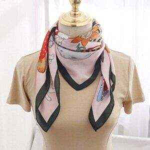 This scarf is made in Italy with 100% silk. The illustration features dressed-up cats on a pastel pink background.