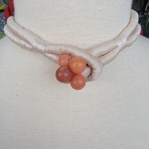 Beautiful shell and beaded necklace on a silk double twist tie. The colors of peaches and cream are so pretty. Can pair w a variety of earrings or wear alone as a statement piece.