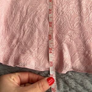 This SilkLand 100% silk blouse in a delicate powder petal pink shade features a soft floral pattern and a ruched V-neck design with a stylish tie front. The 3/4 split bell sleeves and ruffled details enhance its feminine appeal, making it perfect for both casual and elegant occasions. excellent condition womens size medium