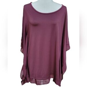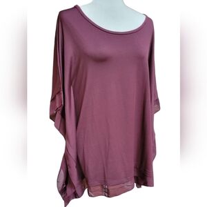Lovely crepe trim at the hem and sleeves for a layered illusion look; bat wing style sleeves.