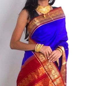 Stunning Saree in Gorgeous Indigo Blue and Ruby Red โค๏ธ๐ Gold Threading details. I'm a novice in wrapping a saree, so forgive my wrapping on the mannequin. It doesn't take away from this beautiful fabric. (1st Picture is Stock Photo, just for reference)