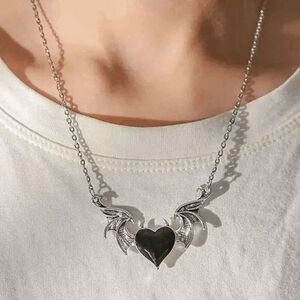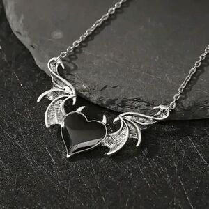 Trendy Silver Black Onyx Heart Wing Necklace
