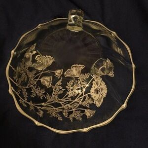 Vintage 1940’s Silver City clear ruffled edge, three footed dish with silver overlay in the Flanders Poppy pattern. This could be used as decor as is, a candy dish, for jewelry. Many options. This should be cleaned with a dry cloth, and never submerged in water. No damage on this beautiful bowl.