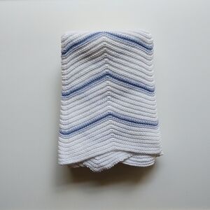 Gorgeous white knit blanket with blue stripes. Two sides have scalloped edges. Perfect blanket for special occasions. Designed in the UK. 100% cotton. #shawl #europe