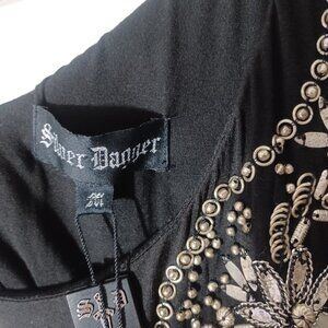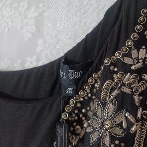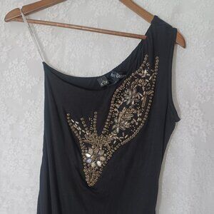 Keywords: Barfly Club New Year Eve Nightlife Party Sexy Medieval Renaissance Heavy Metal Metallic Ornate Beaded Embellished Mini Dress Cocktail Little Black Dress Extra Stretchy Bodycon Evening Bar Date Night Out Asymmetrical Single one shoulder scoop neck sleeveless Tank Top Dress.