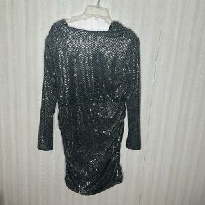 Beautiful drape neck with ruched side black and silver long sleeve dress!