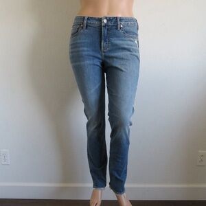 Curvy fit slim leg jeans with a distressed medium indigo wash. High rise, Power stretch denim with highest stretch and recovery, 5-pocket styling with a zip fly. Nite: Size labels have been removed. Measurements based on garment laid flat. Brand new no tags.