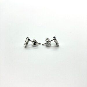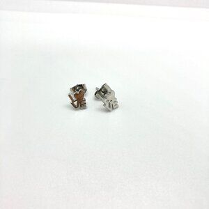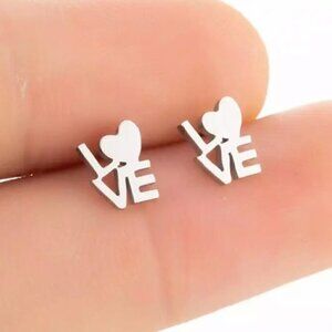 đť…şA pair of silver "love" stud earrings with a heart as the "o". Kind of reminds me of Robert Indiana's "Love" Sculptures. The face of the earring measures approx .5" in diameter. Shown next to a penny to indicate size. Made of silver tone stainless steel. Some photos may cause the earrings to appear black, but they are entirely silver in color, including backings.