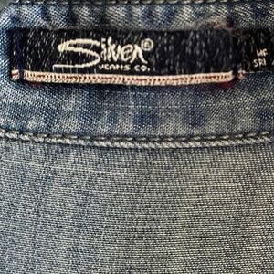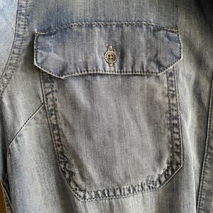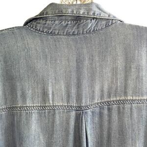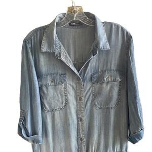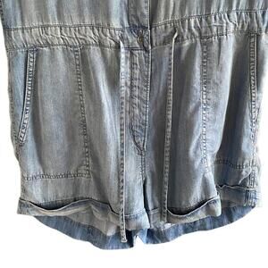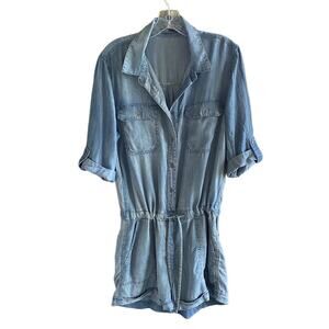 Women's SILVER size Medium Blue Chambray Romper with Drawstring Waist and Roll-Tab Sleeves with Button Front. 100% Lyocell. Good pre-owned condition. Fragrance may be present from laundry products or use.