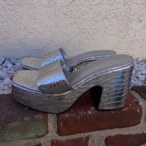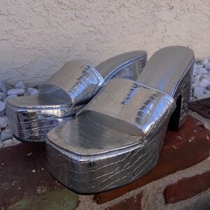 SILVER METALLIC CHUNKY PLATFORMS SLIDES SANDALS HEELS MIRROR BALL DISCO PLEASER