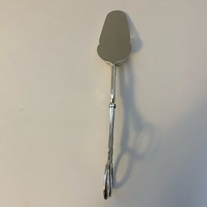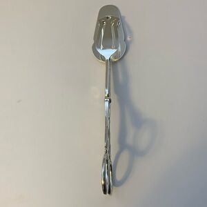 Two serving pieces silver plated. Each are in excellent condition except for minor scratches. Salem from Portugal chalice/goblet. Stands 5 inches. F B Roger’s from Italy serving tongs. 10 1/2 inches. One side is flat and other side is curved.