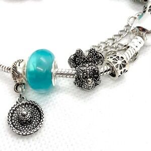 Disney’s Frozen. A silver snake style chain and barrel close clasp, and includes a safety chain. Includes 11 charms, 2 of which the safety chain is attached to. Charms include a Minnie Mouse head, sombrero, hearts with a blue jewel embedded, Elsa dress, Mickey Mouse head, and blue glass beads. Made of silver plated zinc alloy.