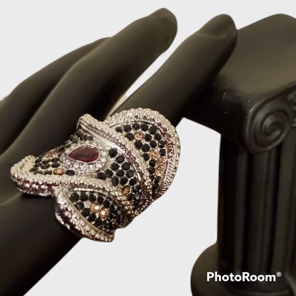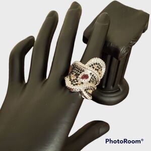 Sterling silver caked in gorgeous black stones accent with a red teardrop stone in the center of the swirling design. So unique, a eye catcher ! New without tags , this ring comes in a velvet jewelry pouch.